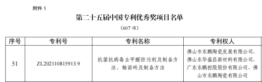 2025年6月5日,中华人民共和国国家知识产权局官网公告了国家知识产权局关于第二十五届中国专利奖授奖的决定,东鹏控股凭借 “抗菌抗病毒去甲醛防污剂及制备方法,釉面砖及制备方法”成功上榜,荣膺中国专利优秀奖,此次是东鹏第四次摘得这一中国专利领域的最高殊荣,充分彰显了公司强劲的科技创新实力, 樱花视频。