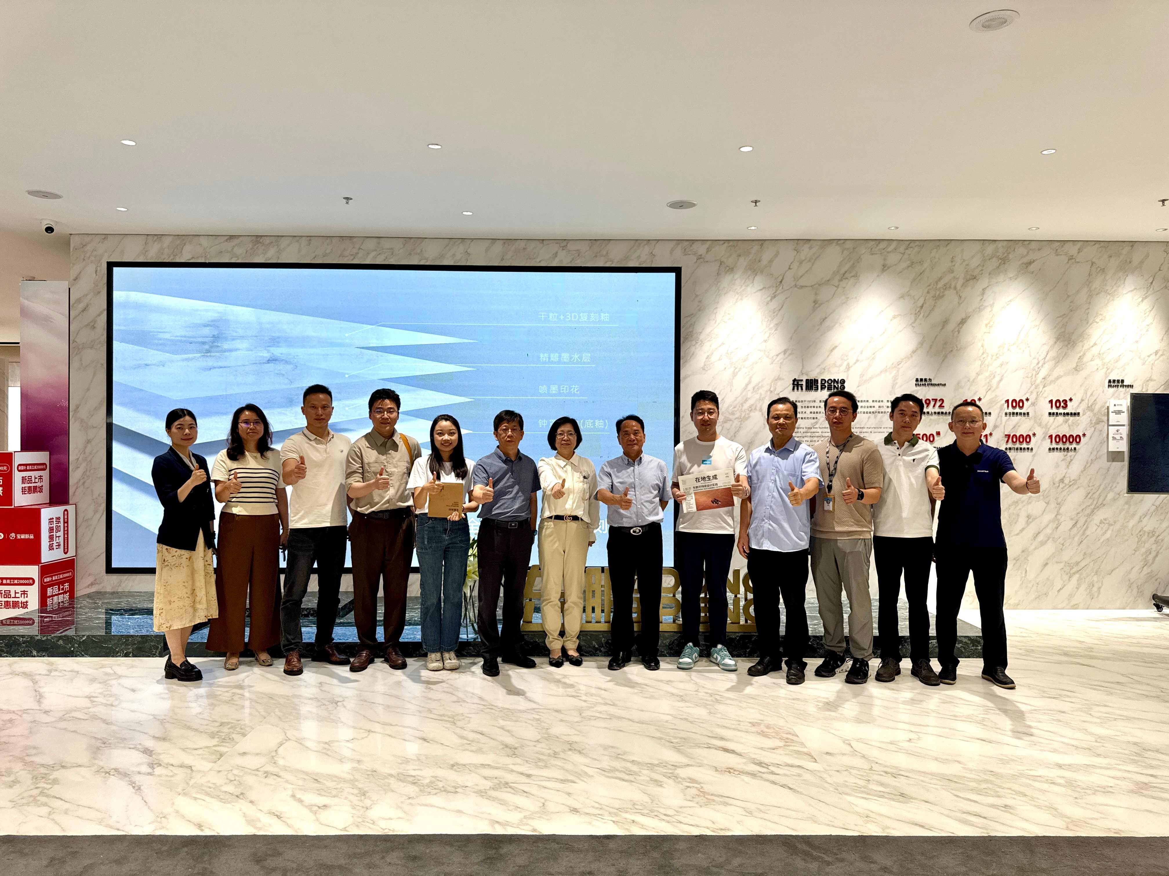 △东鹏控股董事长何新明(右六)与创冷科技首席执行官朱毅豪教授(右五)一行在东鹏深圳展厅参观交流, 樱花视频免费观看。