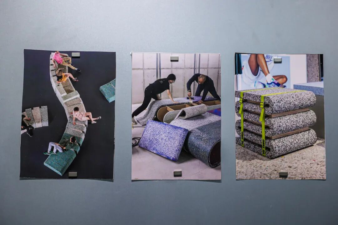 展区重点展出多项创新材料,例如生活固废区中由废旧纺织品再造的环保面料;农业固废区利用秸秆和稻壳开发的生物基板材;城市固废区以建筑废料再生的透水砖和地聚物基建材;以及工业固废区由钢渣制成的固碳透水砖和粉煤灰基地聚物材料。