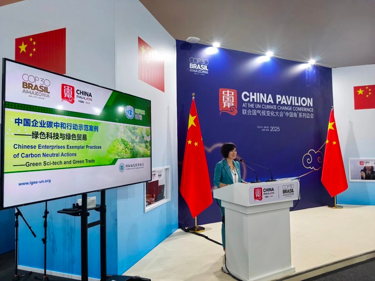 △ 绿协COP30代表,执行秘书长朱立丽以“中国企业碳中和行动示范案例:绿色科技与绿色贸易”为题作分享演讲 樱花视频高清,发布了《中国企业碳中和行动示范实践-IGEA30案例》, 。